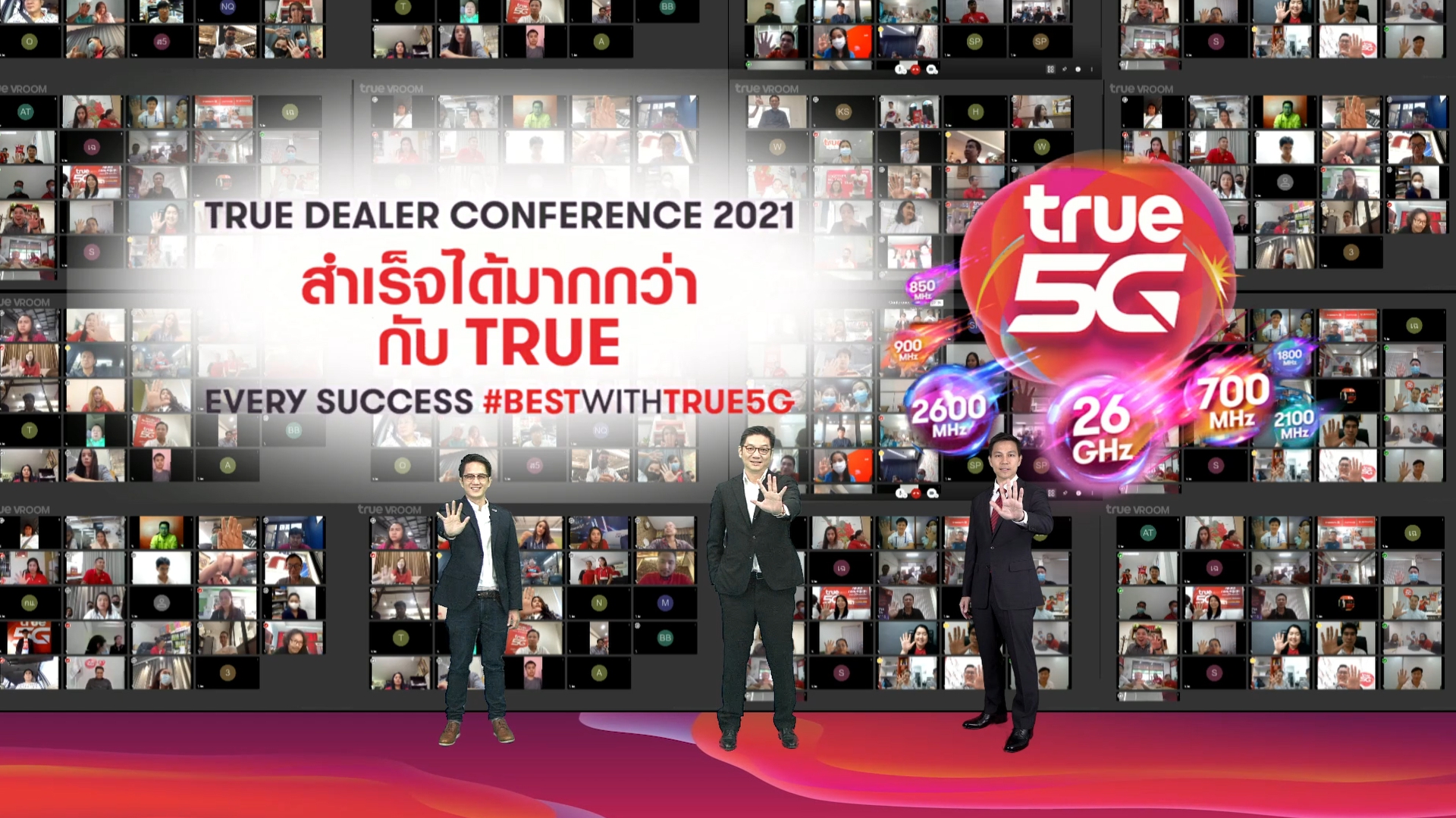 กลุ่มทรู โดย นายมนัสส์ มานะวุฒิเวช (กลาง) ดร.ธีรเดช ดำรงค์พลาสิทธิ์ (ซ้าย) และ นายณัฐวุฒิ อมรวิวัฒน์ (ขวา) กรรมการผู้จัดการใหญ่ (ร่วม) บมจ.ทรู คอร์ปอเรชั่น พร้อมคณะผู้บริหาร จัดสัมมนาพันธมิตรเพื่อนคู่ค้าประจำปี 2564 พร้อมกัน 77 จังหวัดทั่วประเทศ ในรูปแบบที่สอดรับกับ New Normal หรือชีวิตวิถีใหม่ พบเพื่อนคู่ค้ากว่า 1,500 คน แบบ Virtual Conference ผ่าน True VROOM ที่ถ่ายทอดสดจาก TRUE 5G XR STUDIO สตูดิโอผลิตคอนเทนต์แห่งอนาคต เพื่อขอบคุณและสร้างความเชื่อมั่น พร้อมเพิ่มโอกาสทางธุรกิจในการเป็นพันธมิตรคู่ค้าที่จะร่วมสู้ไปด้วยกัน ภายใต้คอนเซ็ปต์ "สำเร็จได้มากกว่ากับ TRUE: EVERY SUCCESS #BESTWITHTRUE5G" โดย กรรมการผู้จัดการใหญ่ (ร่วม) ทั้ง 3 ท่าน ได้กล่าวถึงภาพรวมและกลยุทธ์ทางธุรกิจ ผลิตภัณฑ์ และบริการใหม่ๆ รวมถึงระบบนิเวศดิจิทัล (Digital Eco-System) ที่จะพาเพื่อนคู่ค้าสำเร็จกว่าไปด้วยกันกับทรู พร้อมตอกย้ำความโดดเด่นของกลุ่มทรู ที่ทั้ง “เร็วกว่า”... กับทรู 5G รายแรกและรายเดียว ครบสุดทุกย่านความถี่ มากสุดในไทย โดยปัจจุบันได้เพิ่มสัญญาณบริการทรู 5G แล้วทั่วประเทศ โดยเฉพาะกรุงเทพและปริมณฑลครอบคลุมแล้ว 98% ทำให้ทรูขึ้นแท่นผู้นำ 5G ย้ำภาพความเป็น First Mover ตลอดกาลของกลุ่มทรู และ “ครบกว่า”... กับหลากหลายผลิตภัณฑ์ เพื่อตอบสนองทุกดิจิทัลไลฟ์สไตล์ รวมทั้ง “มากกว่า”... ด้วย Business Solution ที่จะได้ทำงานไปพร้อมกับ Product Eco-System ที่สมบูรณ์ที่สุด ตลอดจน “เหนือกว่า” ... ด้วยรางวัลการันตีคุณภาพสินค้าและบริการ จากเวทีระดับโลก