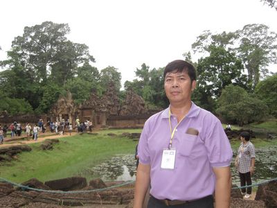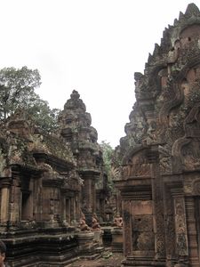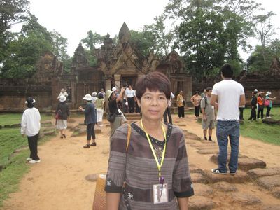 เช้าวันที่ ๓ กันยายน ๒๕๕๓ วันนี้คณะของเราเที่ยวปราสาทถึง ๔ ปราสาท โดยเริ่มจากปราสาทบันเตียสเรย หรือเรียกอย่างไทยว่าปราสาทบันทายสรี อยู่ในกลุ่มเดียวกับปราสาทนครวัด ซื้อบัตรครั้งเดียว เที่ยวที่นี่ได้ด้วย แต่บันเตียสเรยอยู่ไกลตัวเมืองเสียมเรียบถึง 50 กิโลเมตร บันเตียสเรยก่อสร้างในสมัยพระเจ้าชัยวรมันที่ห้า สร้างหลังนครวัด แต่ก่อนนครธม ตัวปราสาทสร้างจากหินทรายสีแดง รูปแกะสลักต่างๆก็ล้วนแต่อ่อนช้อยราวกับคนสร้างเป็นผู้หญิง