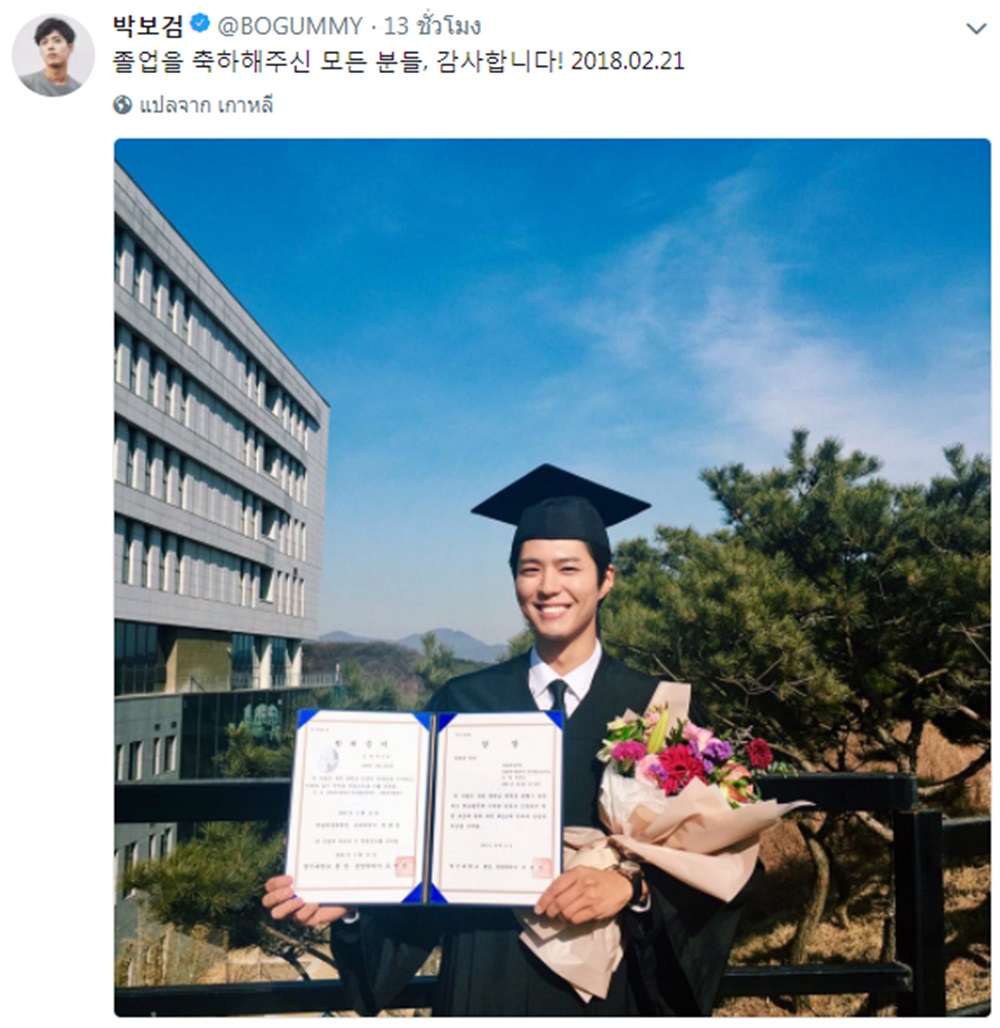 กลายเป็นบัณฑิตป้ายแดงไปอีกคนแล้ว สำหรับนักแสดงหนุ่มแดนโสมขวัญใจทั้งสาวไทย “พัค โบกอม” (Park Bogum) ที่ล่าสุดเจ้าตัวเพิ่งจะเข้าร่วมพิธีรับปริญญาไปเมื่อช่วงบ่ายของวันที่ 21 กุมภาพันธ์ที่ผ่านมา หลังสำเร็จการศึกษาในระดับปริญญาตรี เอกละครเวทีและภาพยนตร์ ที่มหาวิทยาลัยมยองจี วิทยาเขตยงอิน