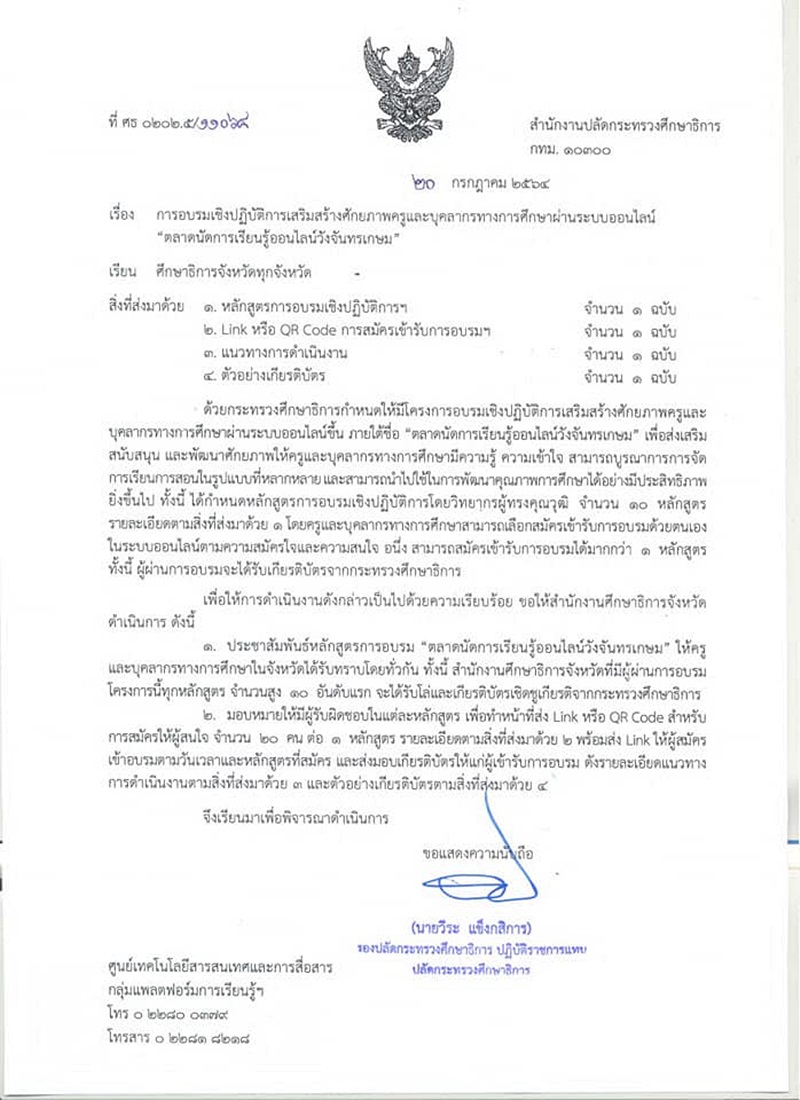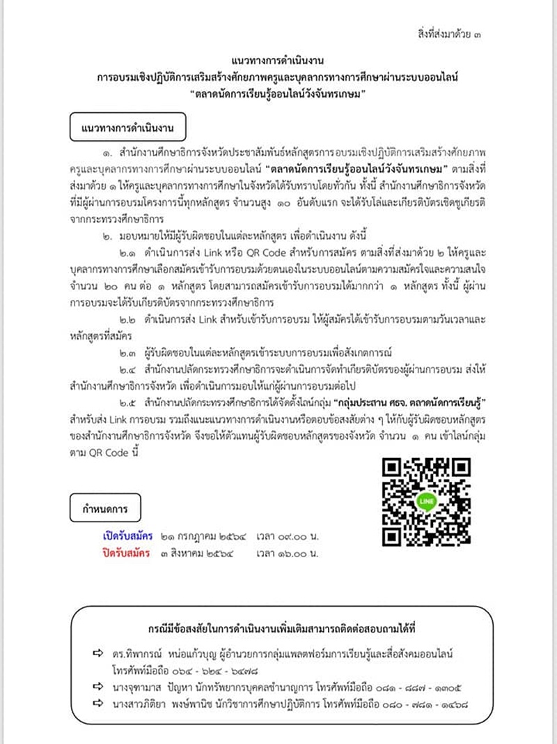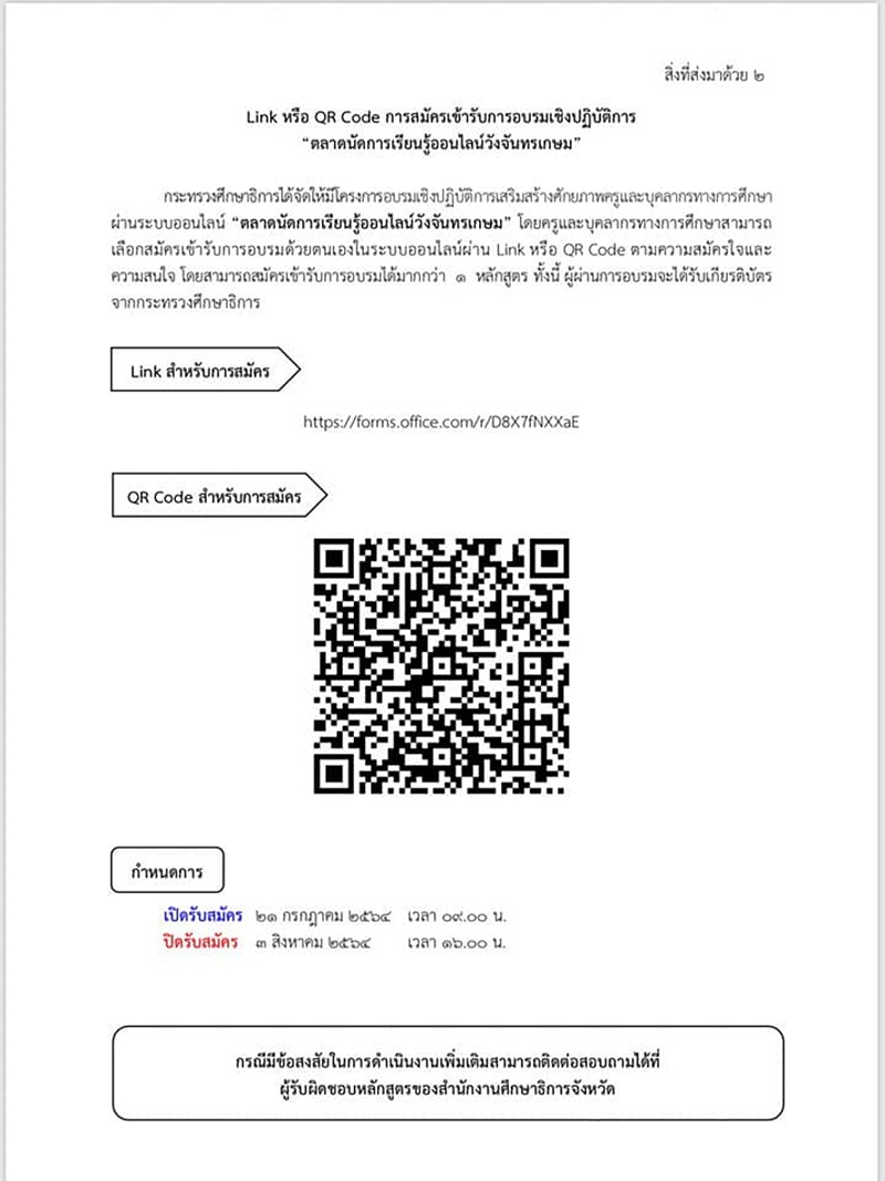 7,510 Viewsโดยครูและบุคลากรทางการศึกษาสามารถเลือกสมัครเข้ารับการอบรมด้วยตนเองในระบบออนไลน์ผ่าน Link หรือ QR Code ตามความสมัครใจและความสนใจ โดยสามารถสมัครเข้ารับการอบรมได้มากกว่า 1 หลักสูตร ทั้งนี้ ผู้ผ่านการอบรมจะได้รับเกียรติบัตรจากกระทรวงศึกษาธิการ