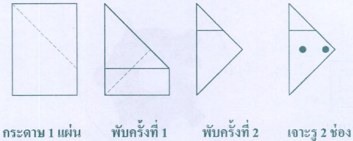 จากรูป แสดงการพับกระดาษและเจาะรู ข้อใดคือรูปกระดาษเมื่อคลี่ออก