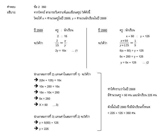 ในปีการศึกษา 2559 โรงเรียนแห่งหนึ่งมีอัตราส่วนของจำนวนครูต่อจำนวนนักเรียนเป็น 2: 15 ถ้าในปีการศึกษา 2560 จำนวนครูและนักเรียนเพิ่มขึ้น 50 คน และ 125 คน ตามลำดับ ทำให้อัตราส่วนดังกล่าวข้างต้นเปลี่ยนแปลงเป็น 1 : 5 แล้วในปีการศึกษา 2560 มีนักเรียนทั้งหมด