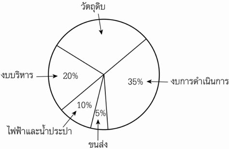 แผนภูมิรูปวงกลมแสดงรายจ่ายของบริษัทแห่งหนึ่ง จากแผนภูมิข้างต้นและรายจ่ายทั้งหมด 4,000,000 บาท ตอบคำถามข้อ 1- 5 ค่าวัตถุดิบเท่ากับเท่าไร