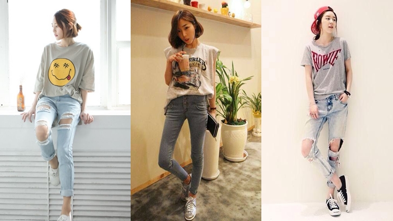 เสื้อยืดเรียบ ๆ กับกางเกงยีนส์ รองเท้าผ้าใบก็ดูเบสิคดี แต่ถ้าอยากแต่งตัวแนว ๆ ชิคกว่านี้ ลองหาเสื้อยืดที่มีลวดลายเท่ ๆ มาใส่ จะแนวสดใส แนวอาร์ท แนวไหนก็เลือกเอาตามใจชอบเลย