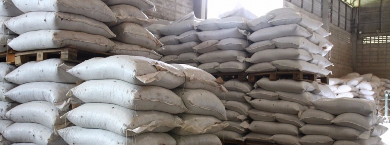 อาหารสัตว์ที่บรรจุใส่กระสอบแล้วจะเก็บไว้ในโรงเก็บ