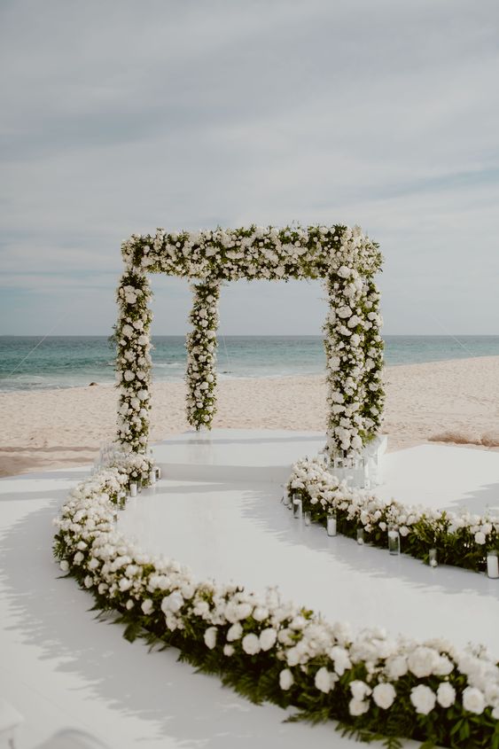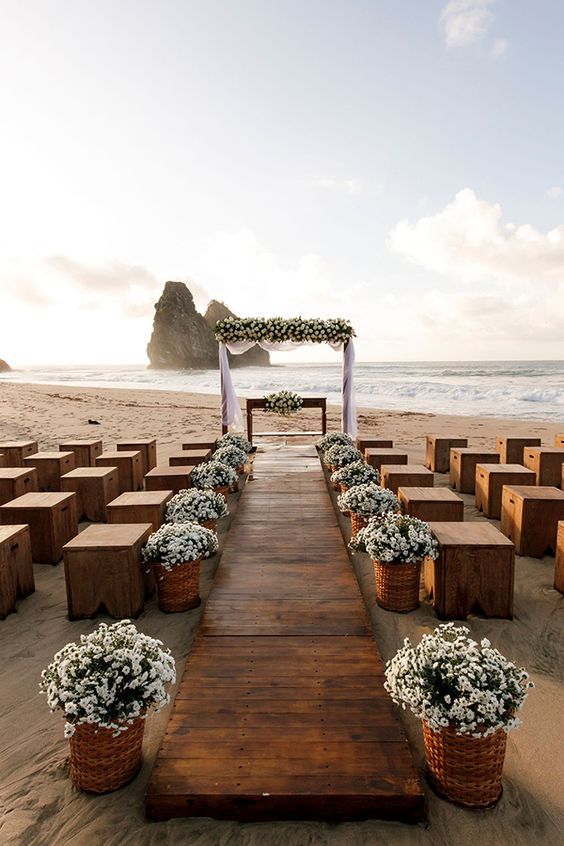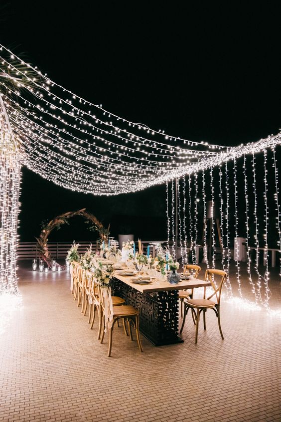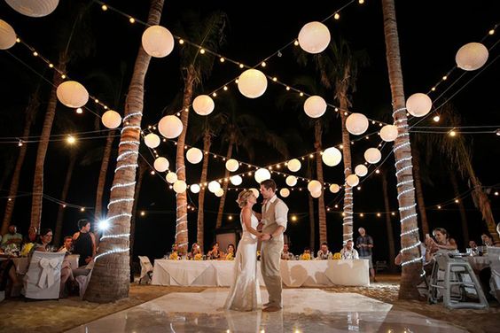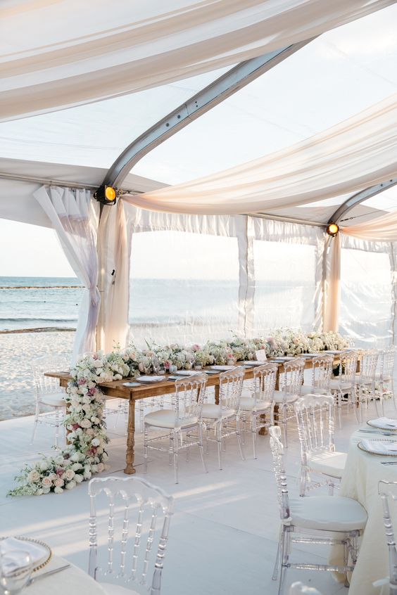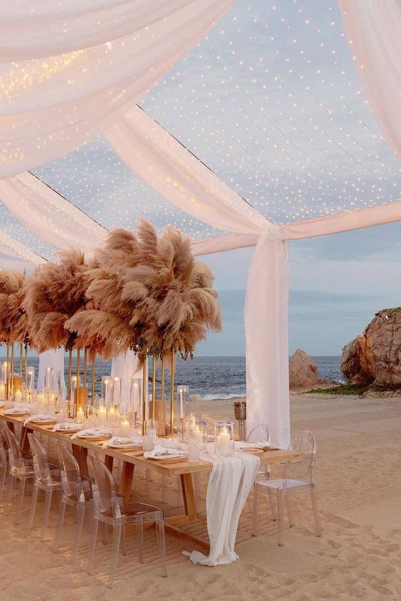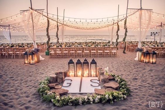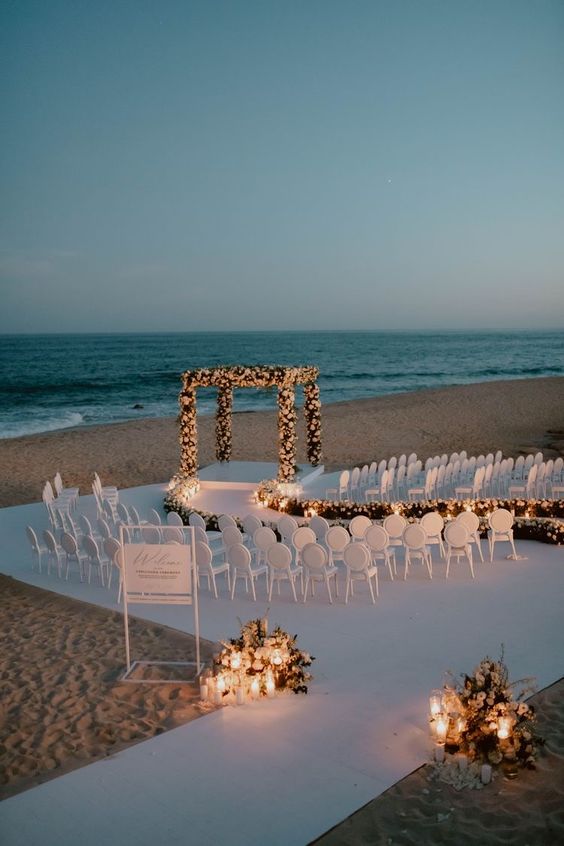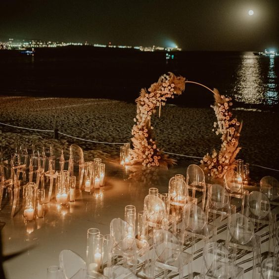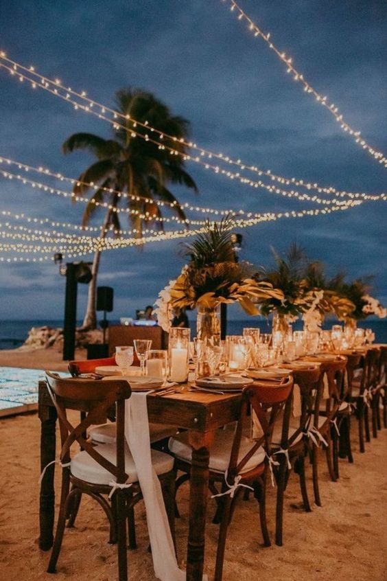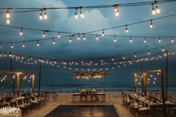 สำหรับใครที่ไม่ชอบออกแดด ทนร้อนไม่ไหว แต่ยังอยากได้ vibe ริมทะเล ก็อาจจะเลือกจัดงานแต่งในช่วงกลางคืนแทน แต่เลือกเป็นช่วงเย็น ๆ ที่พระอาทิตย์กำลังจะลับขอบฟ้าเป็นต้นไปก็ได้ เพราะจะได้เห็นวิวท้องฟ้าไล่สีแสงสีส้มสีฟ้าตัดกับน้ำทะเล พอค่ำ ๆ ก็เสริมความสว่างด้วยไฟประดับระยิบระยับ ให้บรรยากาศโรแมนติดสุด ๆ