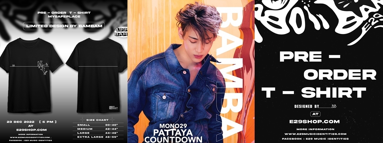 ซึ่ง แบมแบม เผยว่า “สวัสดีครับผมแบมแบมนะครับ วันนี้ผมมีข่าวดีมาบอกทุกคน วันที่ 31 ธันวาคมนี้ เราจะได้พบกันที่งาน “MONO 29 PATTAYA COUNTDOWN 2023” แหลมบาลีฮาย พัทยา ซึ่งปีนี้ผมมีพี่ที่ค่ายฯ พี่ซอนมี กับ พี่ซานดาร่า ปาร์ค มาร่วมคอนเสิร์ตด้วย ส่วนข่าวดีข่าวที่สองคือ ผมได้ออกแบบทีเชิร์ตสุดเอ็กซ์คลูซีฟเพื่อทุกคน ซึ่งเป็นเสื้อที่สามารถใส่ได้ทุกที่ ทุกเวลา และทุกสถานการณ์ ผมตั้งใจดีไซน์เสื้อตัวนี้มาก หวังว่าทุกคนจะชอบ อยากให้สนับสนุนเสื้อยืดของผมด้วยนะครับ ยังไงเดี๋ยวเราเจอกันในเร็ว ๆ นี้นะครับ”