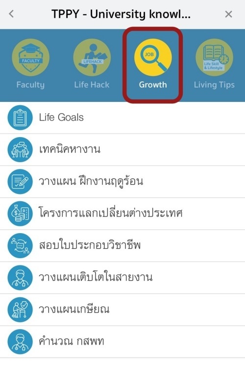 เมนู GROWTH ถูกออกแบบมาเพื่อช่วยให้นักศึกษาเติบโตทั้งด้านการเรียนและพัฒนาตัวเองอย่างรอบด้าน โดยมีเนื้อหาครอบคลุมหัวข้อต่าง ๆ เช่น