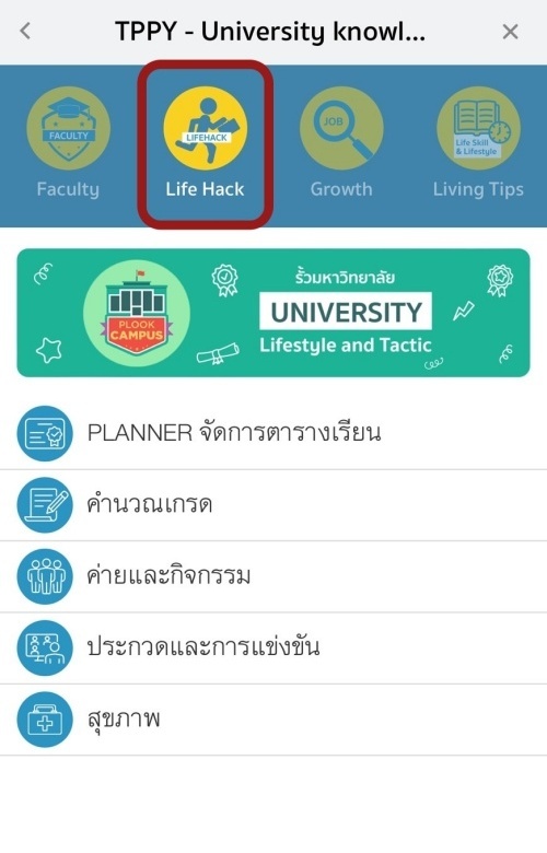 เมนู LIFE HACK ช่วยให้การใช้ชีวิตในมหาวิทยาลัยเป็นเรื่องง่ายและสนุกมากขึ้น โดยมีเนื้อหาครอบคลุมเรื่องต่าง ๆ เช่น
