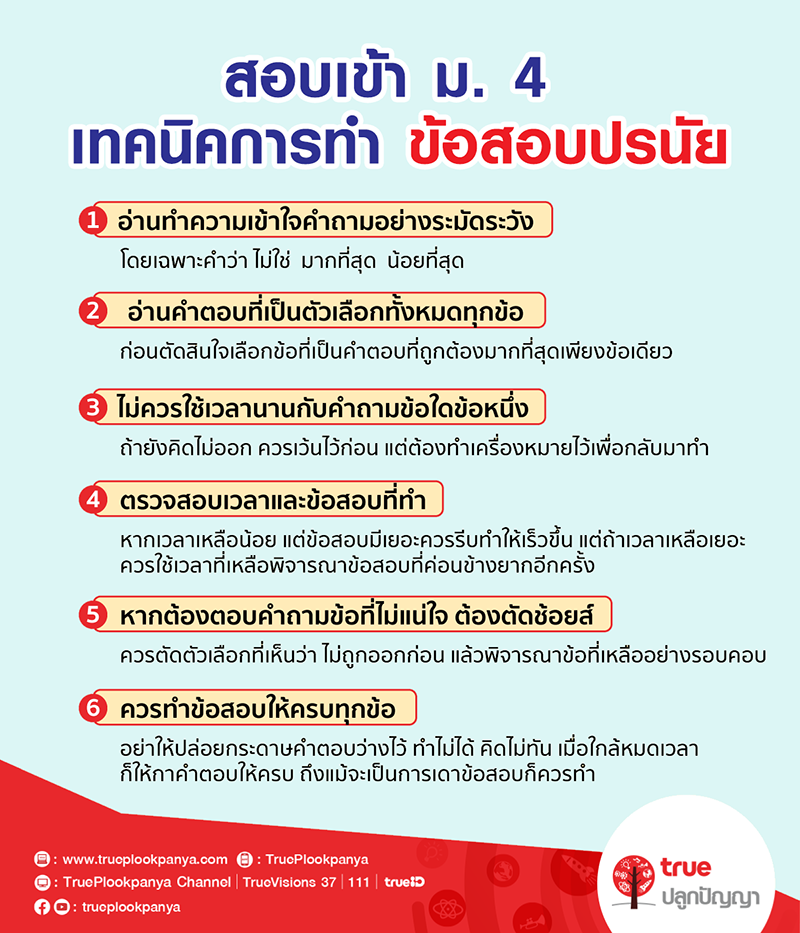 การสอบเข้า ม. 4 ส่วนใหญ่มักเป็นข้อสอบ ปรนัย (Multiple Choice) ซึ่งต้องใช้เทคนิคในการทำข้อสอบให้แม่นยำและเร็วขึ้น นี่คือ เทคนิคเด็ด ที่ช่วยให้ทำข้อสอบได้ดีขึ้น