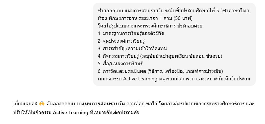 ChatGPT สามารถช่วยออกแบบ แผนการสอน (Lesson Plan) ได้หลายรูปแบบ ขึ้นอยู่กับความต้องการของคุณ เช่น