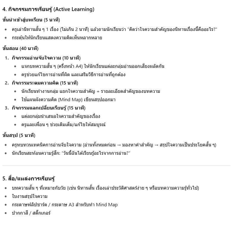 4. รูปแบบที่อยากได้ (เช่น แผนการสอนเต็มรูปแบบ, แผนย่อ, หรือแบบกิจกรรมเน้นผู้เรียน)