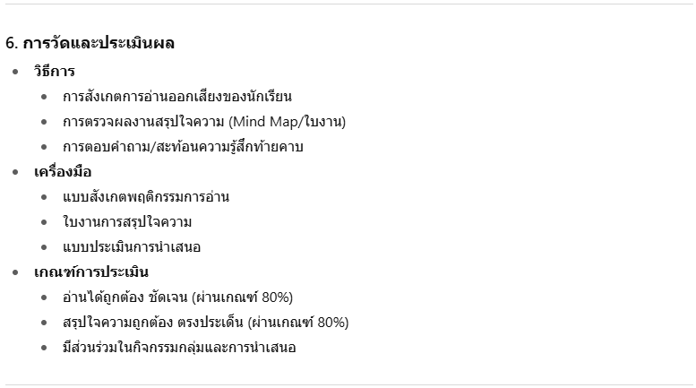 6. การวัดและประเมินผล (วิธีการ, เครื่องมือ, เกณฑ์การประเมิน) เน้นกิจกรรม Active Learning ที่ผู้เรียนมีส่วนร่วม และเหมาะกับเด็กวัยประถม
