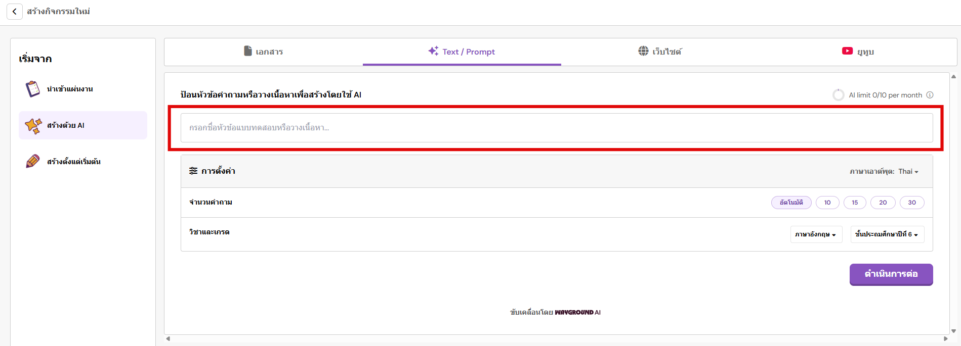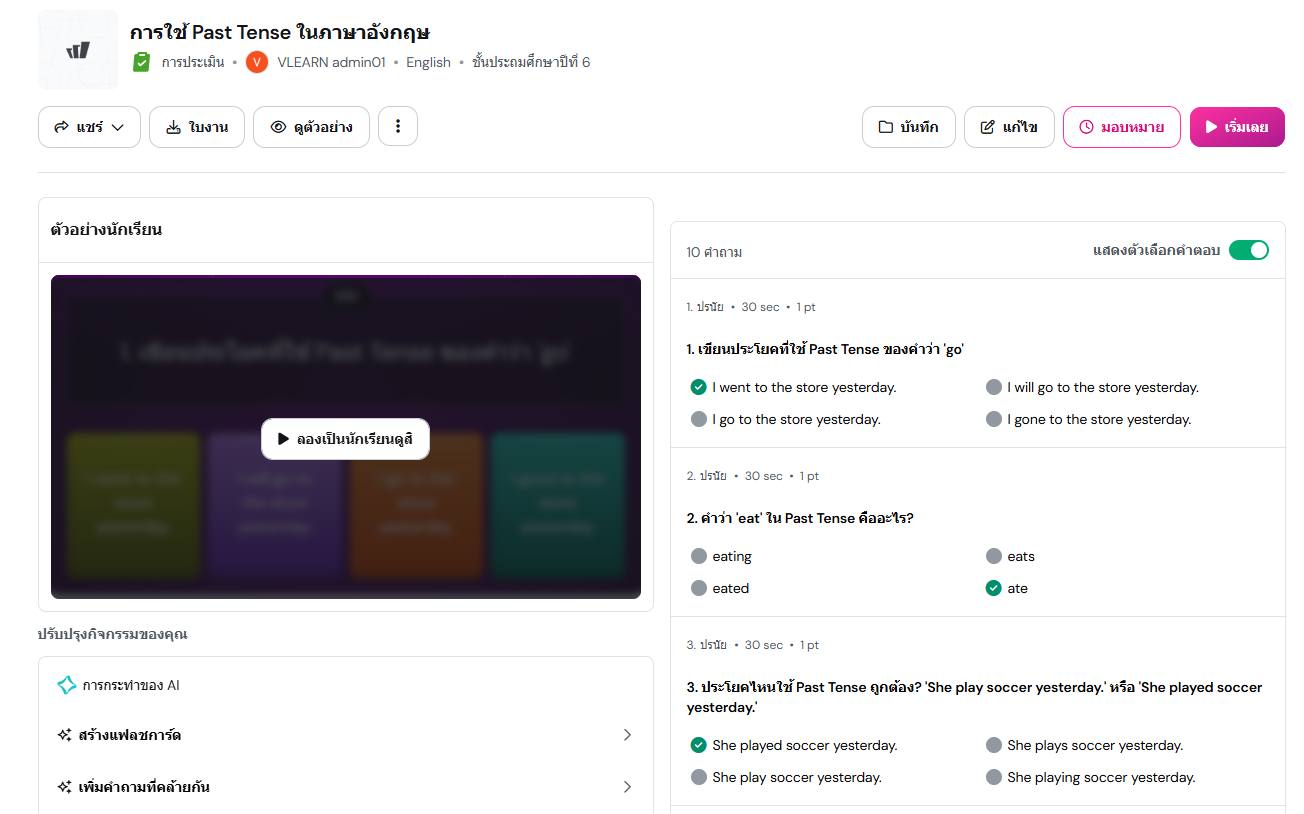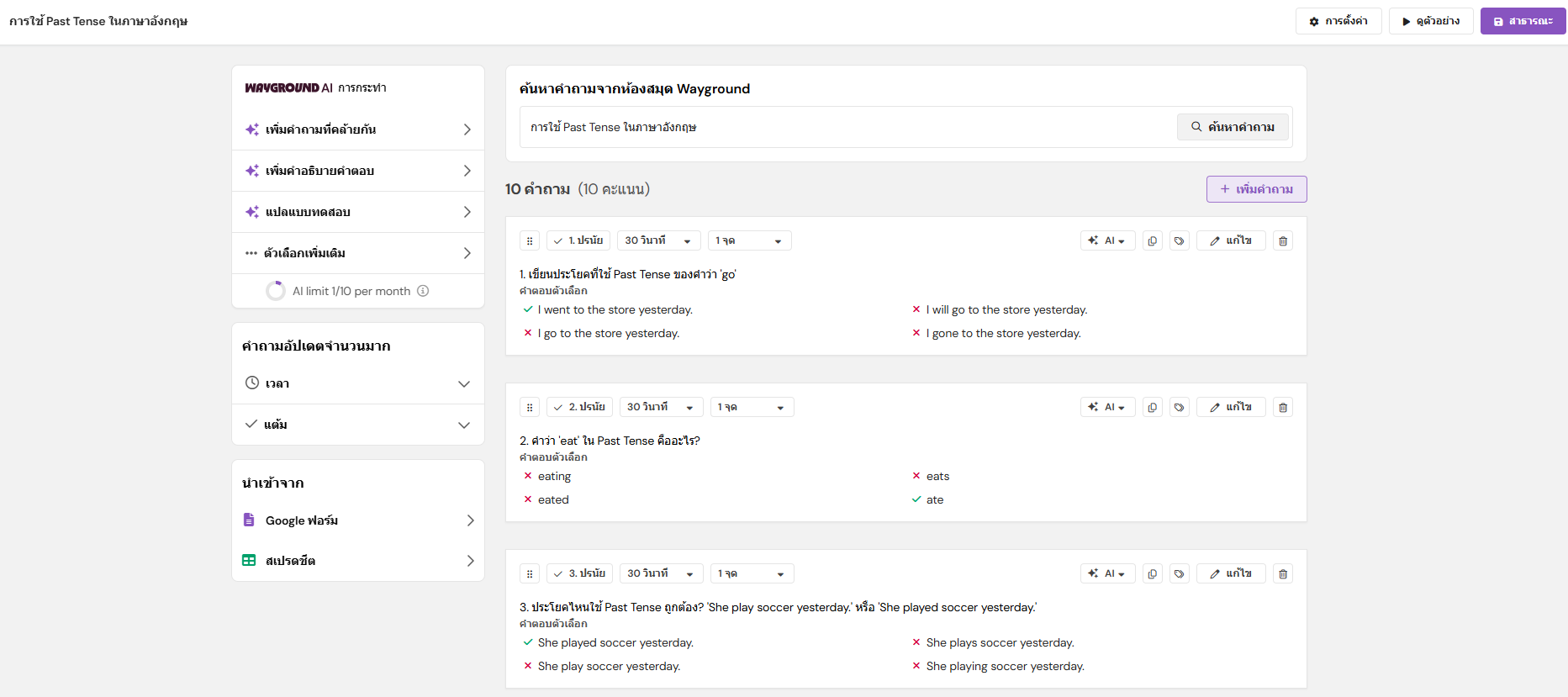 เมื่อได้ Prompt ที่ต้องการแล้ว Ai จะ Generate ข้อสอบออกมาให้ โดยเราสามารถเข้าไปแก้ไขข้อมูลการให้คะแนน เพิ่มคำถาม ตั้งเวลาในการทำข้อสอบและอื่น ๆ อีกมากมาย เมื่อตั้งค่าจนเสร็จแล้วให้คลิกที่ปุ่ม สาธารณะ
