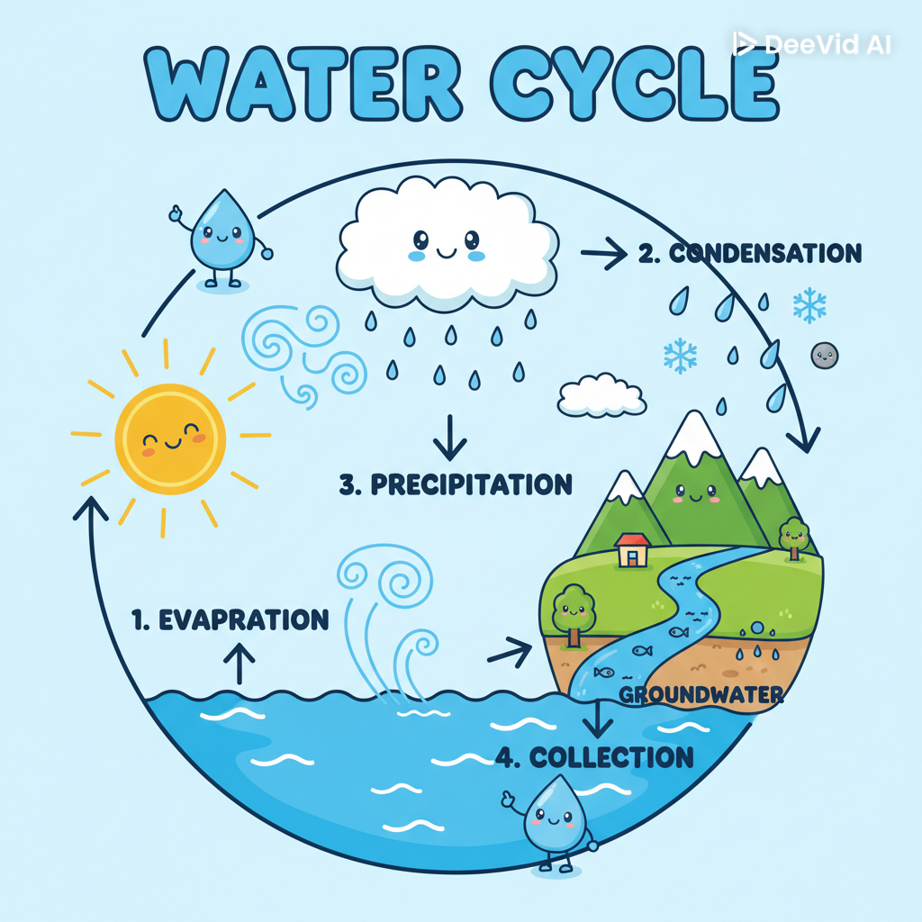 คำสั่ง : ออกแบบ infographic แสดงวงจรน้ำ (Water Cycle) สำหรับเด็กประถม ใช้ภาพการ์ตูนเข้าใจง่าย