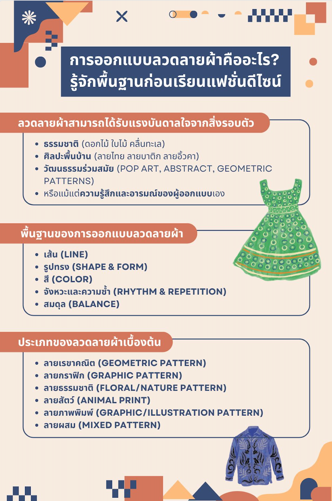 ในอุตสาหกรรมแฟชั่น “ผ้า” ไม่ได้เป็นเพียงวัสดุ แต่คือเครื่องมือในการสื่อสารอัตลักษณ์ของแบรนด์ การเข้าใจพื้นฐานของการออกแบบลวดลายผ้าจะช่วยให้นักศึกษาแฟชั่นดีไซน์สามารถสร้างผลงานที่แตกต่าง มีเอกลักษณ์ และตอบโจทย์ตลาดได้จริง