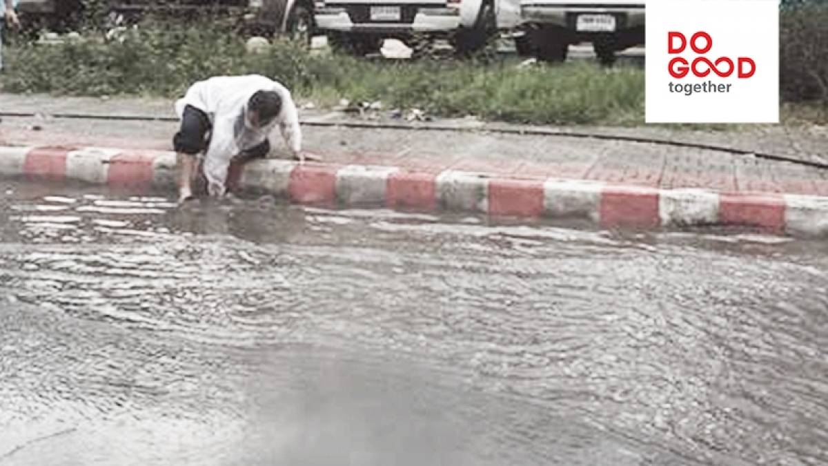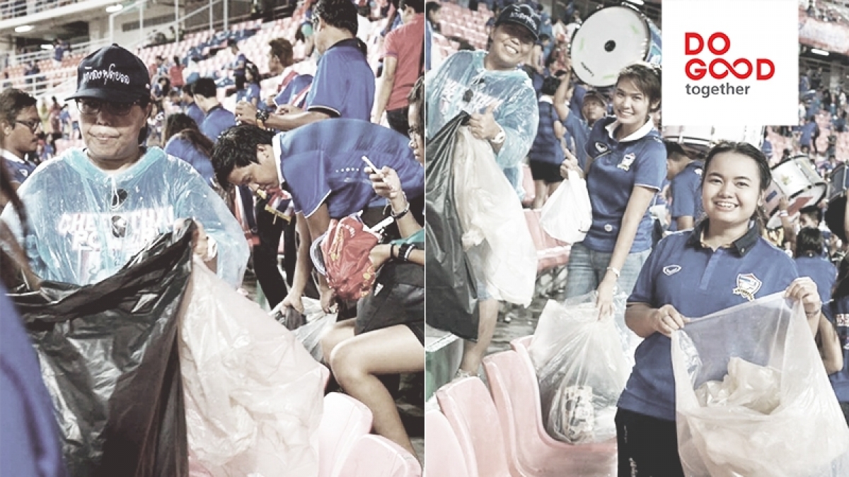 ภายหลังจากเกมการแข่งขันฟุตบอลโลก 2018 รอบคัดเลือก ระหว่างทีมชาติไทยและทีมชาติญี่ปุ่น แฟนบอลไทยกำลังลงมือช่วยกันเก็บขยะท่ามกลางสายฝนที่โปรยปราย ก่อนเดินออกจากสนาม