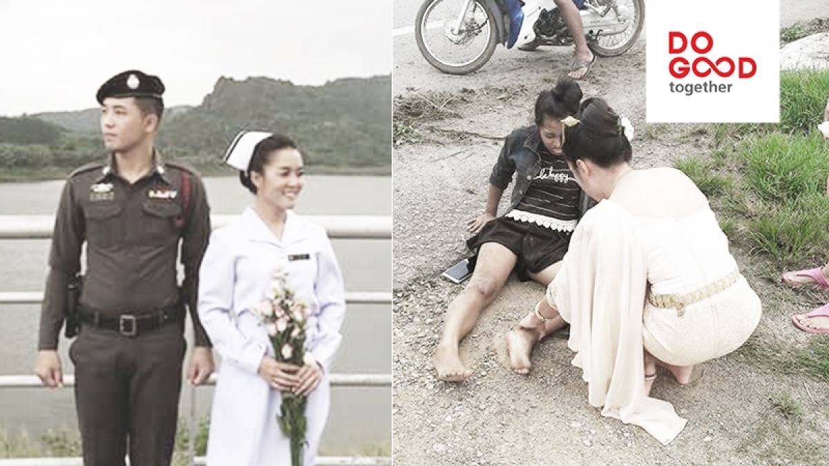 พยาบาลสาว Silanee Somjai กำลังอยู่ระหว่างการเดินทางไปถ่ายภาพพรีเวดดิ้ง แต่ระหว่างทางพบอุบัติเหตุ จึงจอดรถลงมาช่วยเหลือผู้บาดเจ็บแทน ทั้ง ๆ ที่ยังคงสวมชุดไทยสำหรับการถ่ายพรีเวดดิ้งอยู่
