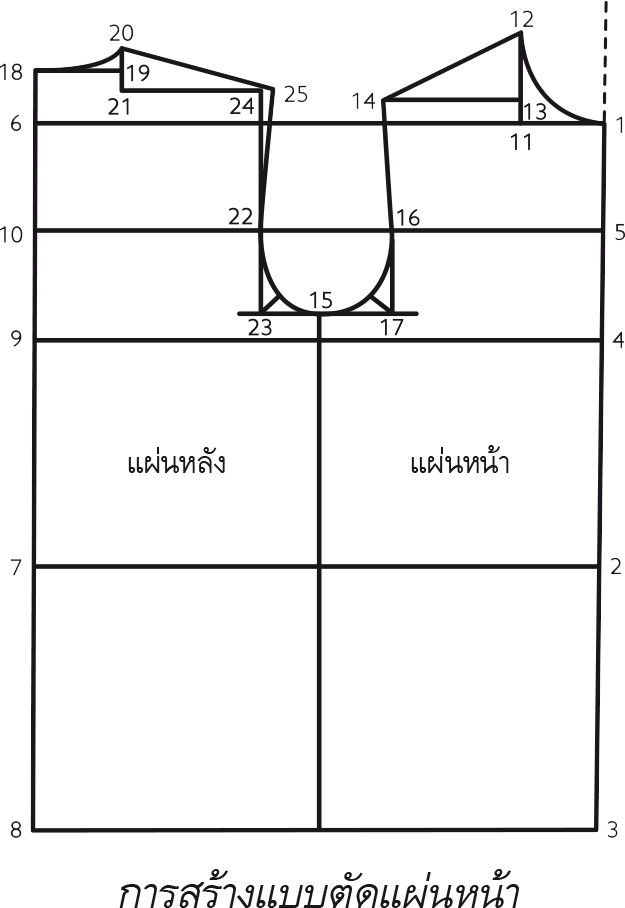 20–25 ลากเส้นต่อกันเป็นแนวตะเข็บไหล่ โค้งวงแขนหลังจากจุด 25 ผ่านจุด 22 ถึงจุด 15