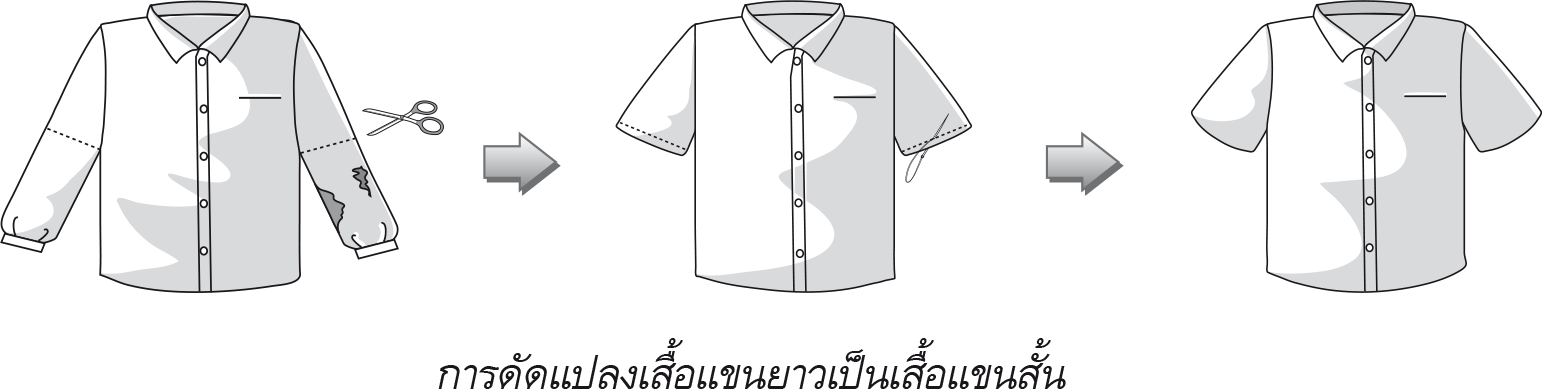 1) เสื้อแขนยาวทำเป็นเสื้อแขนสั้น โดยการตัดแขนทั้งสองข้างให้เท่ากัน แล้วเย็บตะเข็บด้วยจักรเย็บผ้าหรือเย็บมือให้มั่นคงแข็งแรงสวยงาม