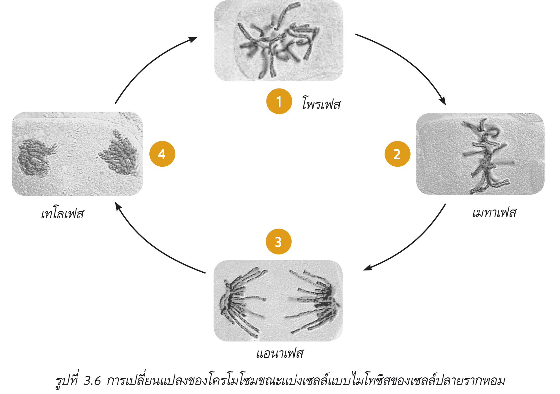 การแบ่งเซลล์แบบไมโทซิส : จำนวนเซลล์ของร่างกายโดยเซลล์เดิมออกเป็นเซลล์ใหม่ 2 เซลล์