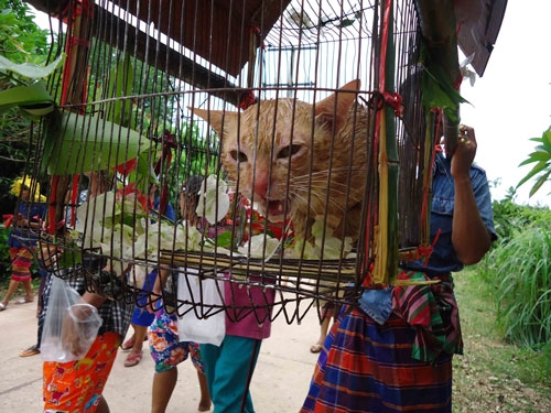 แมวที่ขอฝนได้นั้นต้องเป็นแมวตัวเมีย พันธุ์สีสวาดหรือมาเลศ เพราะสีของขนที่เป็นสีเดียวกับเมฆจะบันดาลให้เกิดฝน บางที่ก็ใช้แมวดำ โดยต้องเป็นแมวที่มีลักษณะปราดเปรียว สวยงาม ประมาณ 1-3 ตัว จับมาใส่ในกระบุง ตะกร้า หรือเข่งพาแห่ทั่วหมู่บ้านพร้อมกับร้องเพลงแห่นางแมว ของแถมของพิธีนี้จึงเป็นการสร้างความสัมพันธ์ระหว่างลูกบ้านในหมู่บ้านให้แน่นแฟ้นขึ้นจากการช่วยกันประกอบพิธีอีกด้วยครับ แต่หากมีคนปักตะไคร้ตอนแห่นางแมว พี่ปลูกไม่รับรองผลนะครับว่าฝนจะตกหรือไม่ตกดี :)