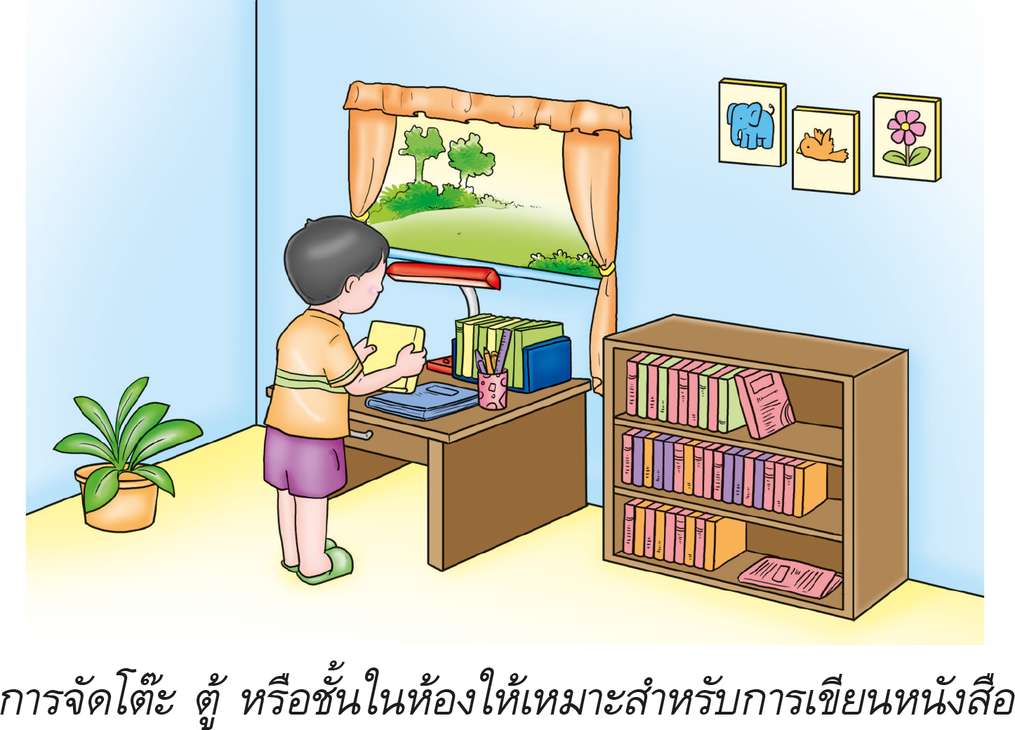 ควรตั้งโต๊ะเตี้ยๆในที่ที่แสงสว่างส่องทางซ้ายมือ วางตู้ และชั้นวางไว้ข้างๆ ควรมีโคมไฟไว้สำหรับเปิดในเวลากลางคืน ใช้ที่คั่นหนังสือจัดหนังสือและสมุดหันสันออก และควรมีขยะวางไว้ข้างๆโต๊ะ