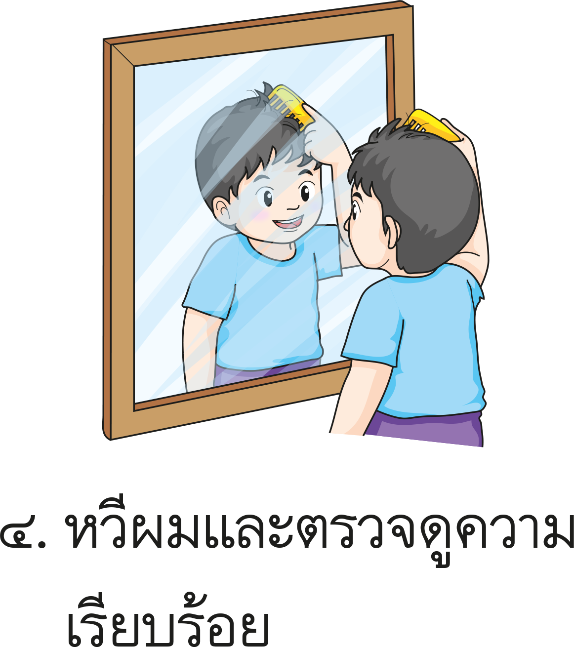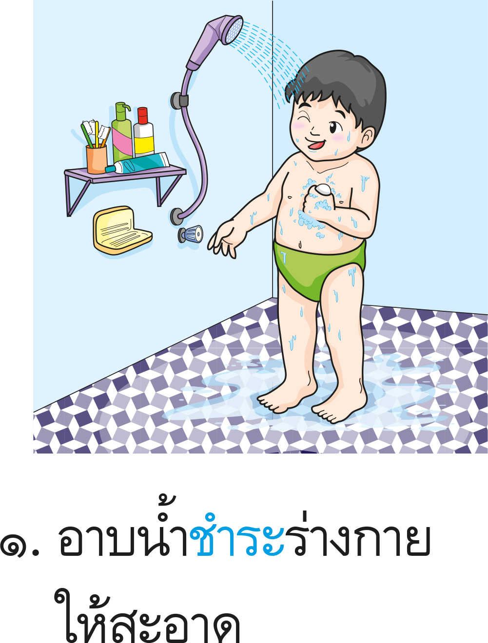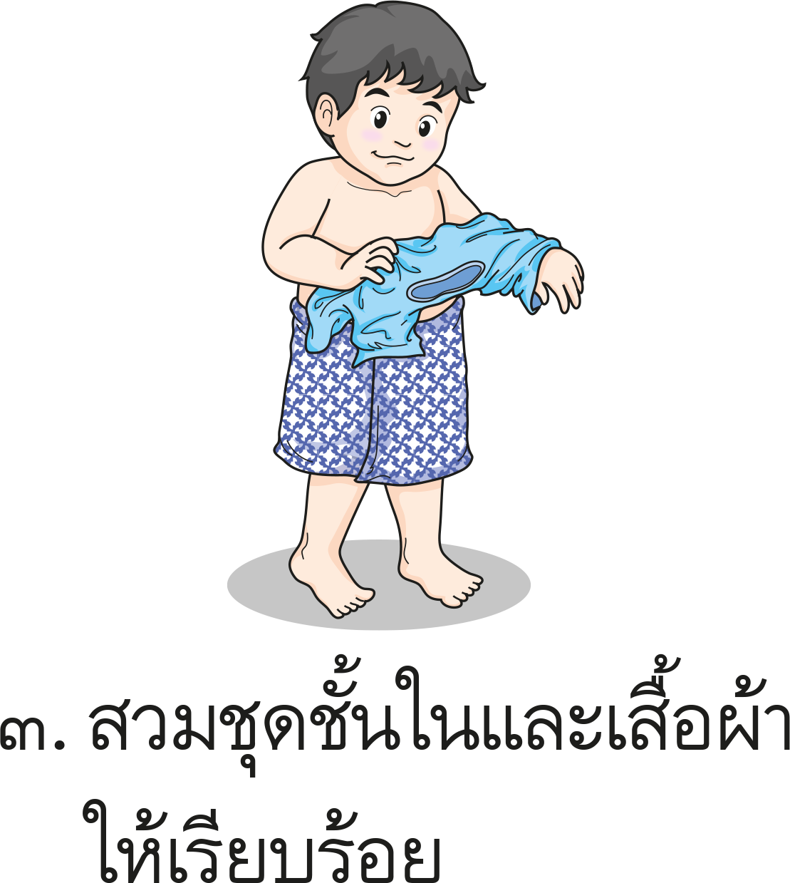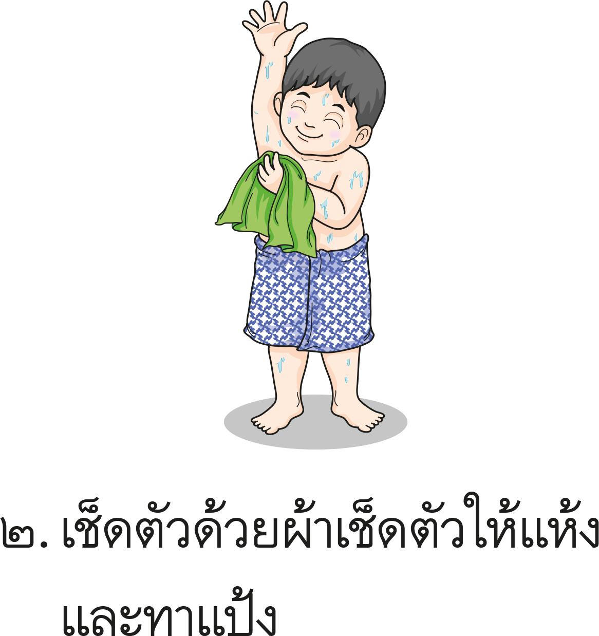 อาบน้ำให้สะอาด เช็ดตัวให้แห้งและทาแป้ง สวมชุดชั้นในและเสื้อผ้า หวีผมพร้อมตรวจดูความเรียบร้อย