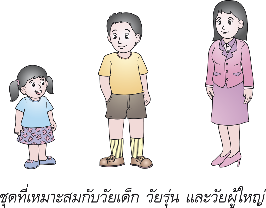 – เลือกเสื้อผ้าให้เหมาะสมกับวัยผู้สวมใส่ เช่น วัยเด็กควรใส่เสื้อผ้าที่มีสีสันสดใส สวมใส่สบาย