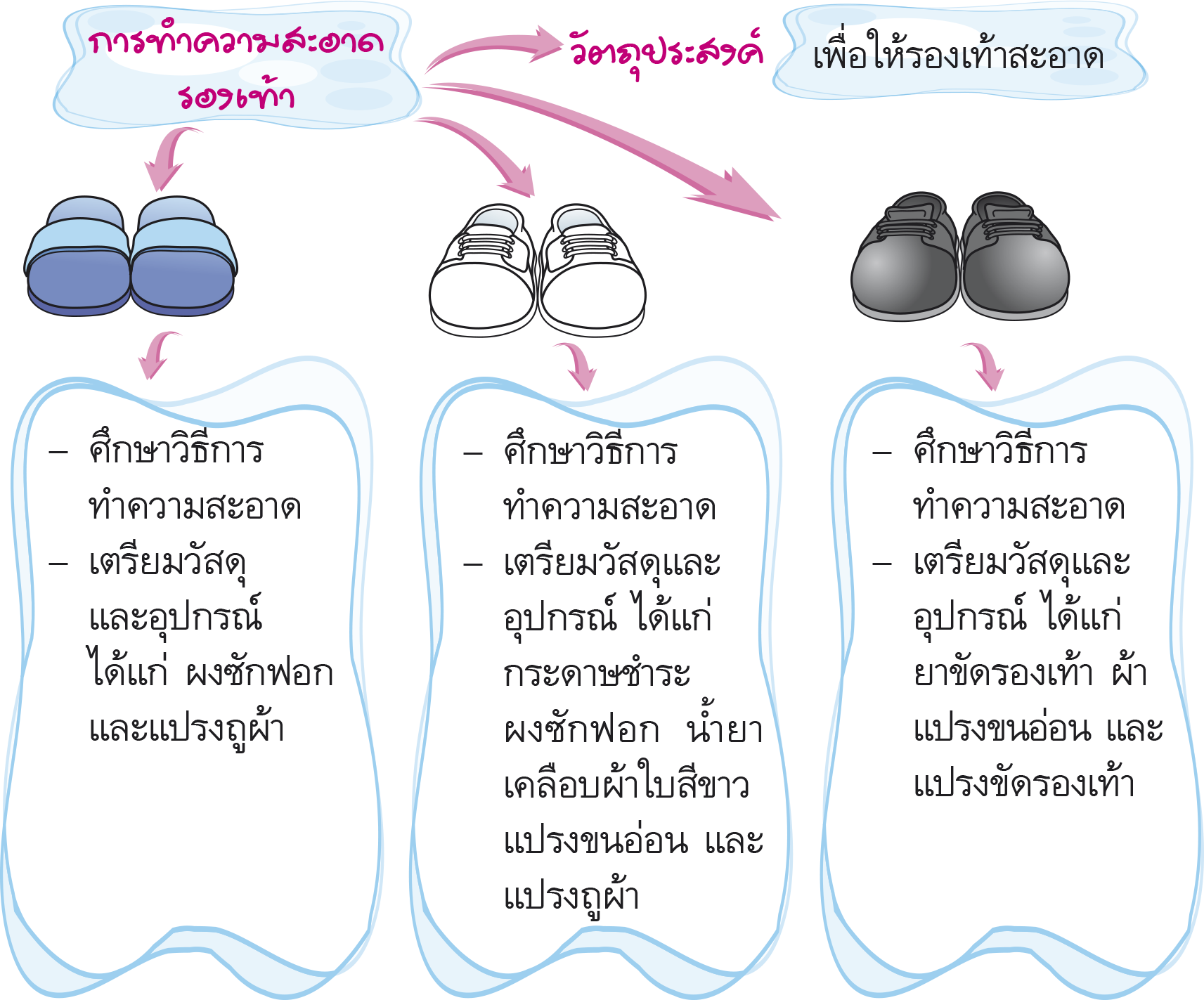 2. การปฏิบัติ ลงมือทำตามแผนที่วางไว้ โดยรองเท้าแต่ละชนิดจะมีวิธีการทำความสะอาดต่างกัน เช่น รองเท้าผ้าใบ ต้องแยกเชือกผูกรองเท้าออกก่อนแล้วจึงนำไปแช่ในน้ำเปล่า หลังจากนั้นนำไปแช่ในน้ำผสมผงซักฟอก และขัดรอยเปื้อนออกจนสะอาด เสร็จแล้วล้างด้วยน้ำสะอาดอีกรอบ ต่อมานำมากระดาษชำระมาแปะให้ทั่วแล้วค่อยนำไปตาก ส่วนรองเท้าหนังใช้แปรงขัดฝุ่นออก นำผ้าชุบน้ำเช็ดรอยเปื้อนออก หลังจากนั้นนำผ้าแห้งมาเช็ดอีกรอบ เสร็จแล้วนำยาขัดรองเท้ามาขัดให้ทั่ว แล้วใช้ผ้าแห้งมาขัดจนรองเท้าขึ้นเงาจึงนำไปผึ่งแดด