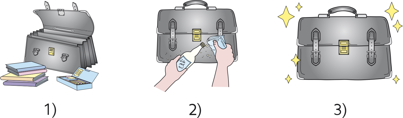 การทำความสะอาดกระเป๋านักเรียน มีขั้นตอนตามกระบวนการดังนี้