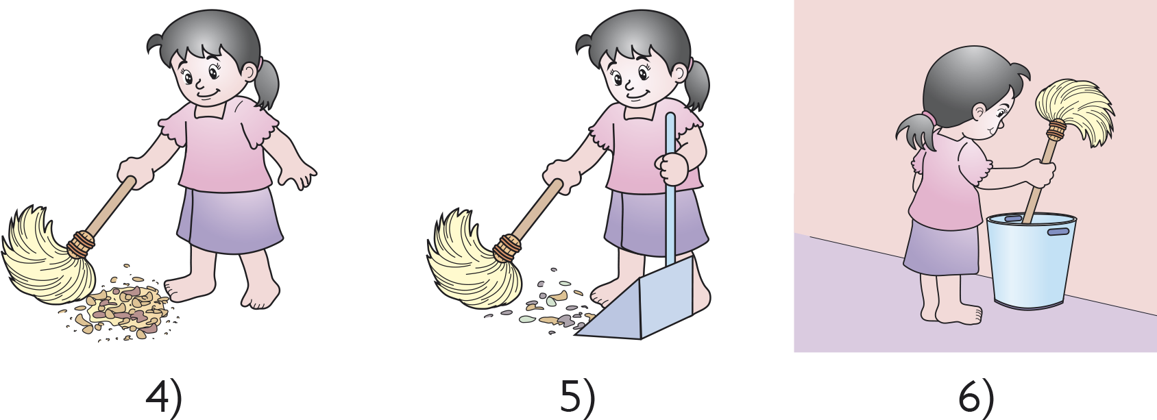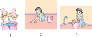 – การถูบ้านโดยใช้ไม้ถูพื้น นำส่วนที่เป็นผ้าขี้ริ้วชุบน้ำแล้วบิดหมาด จับตรงด้ามไม้ถูพื้น ถูจากด้านในออกมาด้านนอก ซักผ้าขี้ริ้วบ่อย ๆ แล้วถูต่อจนเสร็จ
