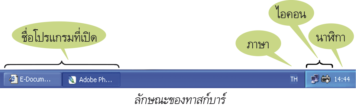 – ทาสก์บาร์ เป็นที่อยู่ของปุ่มที่ใช้งานบ่อย