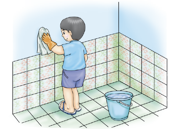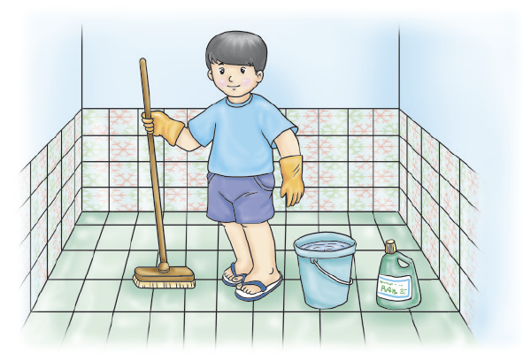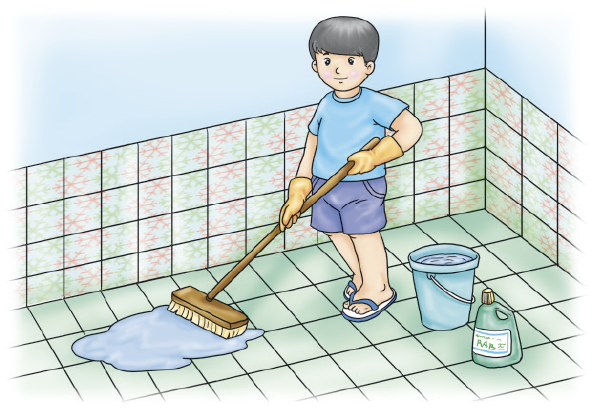 2. การปฏิบัติงาน ใส่ถุงมือแล้วเริ่มขัดผนังห้องน้ำ ล้างออกด้วยน้ำสะอาด และมาขัดสุขภัณฑ์ต่าง ๆ ราดน้ำยาล้างห้องน้ำให้ทั่วพื้น แล้วล้างออกด้วยน้ำสะอาด