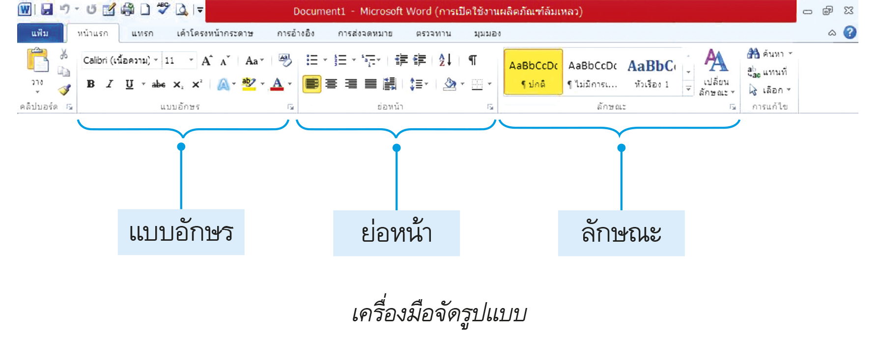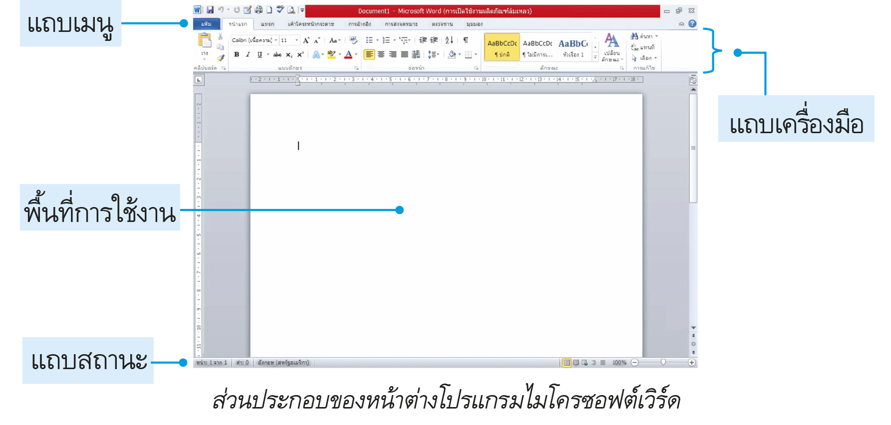 วิธีที่ 2 เรียกใช้งานโปรแกรมไมโครซอฟเวิร์ดจากปุ่มสตาร์ท หน้าต่างโปรแกรมไมโครซอฟเวิร์ด ประกอบด้วย