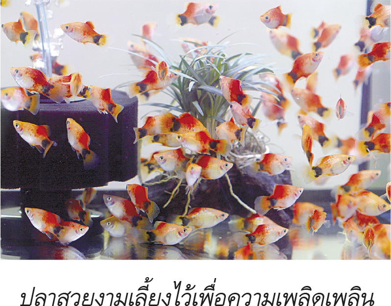 การจัดการผลผลิต ควรนำตู้ปลาทองไปตั้งไว้ในห้องรับแขกหรือห้องนั่งเล่นเพื่อสร้างบรรยากาศให้น่าอยู่ยิ่งขึ้น