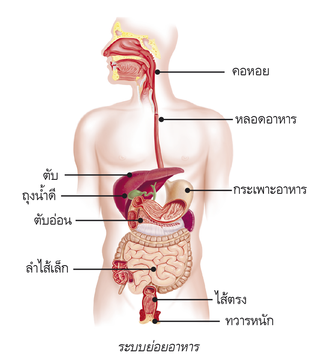 ระบบย่อยอาหาร (the digestive system) ทำหน้าที่ย่อยอาหารให้ละเอียด และดูดซึมผ่านเข้าสู่กระแสเลือด เพื่อไปเลี้ยงและซ่อมแซมเนื้อเยื่อส่วนต่าง ๆ ของร่างกาย มี ฟัน ลิ้น ต่อมน้ำลาย คอหอย หลอดอาหาร กระเพาะอาหาร ลำไส้เล็ก ลำไส้ใหญ่ ตับ ถุงน้ำดี และตับอ่อน เป็นองค์ประกอบที่สำคัญในกลไกการย่อย