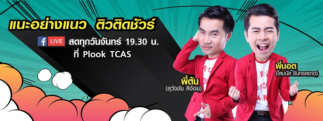 Plook TCAS LIVE พื้นที่เรียนไม่มีคำว่าเครียด กับติวเตอร์สายฮา พี่ต้น สุวัจชัย ลีจ้อย และพี่นอต โสมนัส จันทรสอาด ที่จะมาพูดคุยกันภาษาเด็กยุค TCAS และติวเตรียมสอบกันแบบสด ๆ ทุกวันจันทร์ เวลา 19.30 น. ทางแฟนเพจ