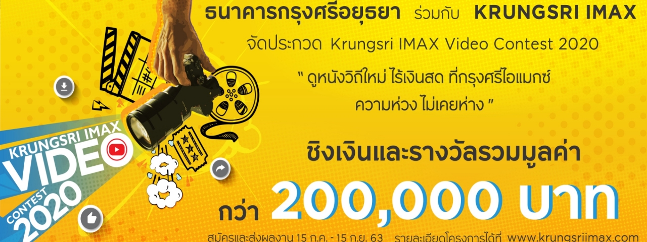 ธนาคารกรุงศรีอยุธยา ร่วมกับ Krungsri IMAX ขอเชิญนักเรียน นักศึกษา และประชาชนทั่วไป ส่งผลงานเข้าร่วมการประกวดคลิปวิดีโอ Krungsri IMAX Video Contest 2020 หัวข้อ “ดูหนังวิถีใหม่ ไร้เงินสด ที่กรุงศรีไอแมกซ์ ความห่วง ไม่เคยห่าง” ชิงรางวัลรวมมูลค่ากว่า 200,000 บาท พร้อมถ้วยรางวัล และประกาศนียบัตร ส่งผลงานได้ตั้งแต่วันนี้ - 15 กันยายน 2563