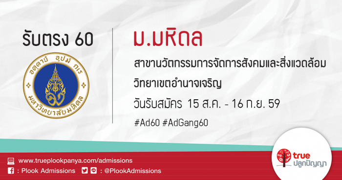 มหาวิทยาลัยมหิดล รับสมัครบุคคลเพื่อคัดเลือกเข้าเป็นนิสิตระดับปริญญาตรี สาขาวิชานวัตกรรมการจัดการสังคมและสิ่งแวดล้อม วิทยาเขตอำนาจเจริญ ประจำปีการศึกษา 2560