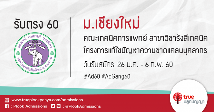 มหาวิทยาลัยเชียงใหม่ รับสมัครสอบคัดเลือกบุคคลเข้าศึกษา คณะเทคนิคการแพทย์ สาขาวิชารังสีเทคนิค เพื่อแก้ไขปัญหาความขาดแคลนบุคลากรด้านรังสีเทคนิคในโรงพยาบาล ประจำปีการศึกษา 2560