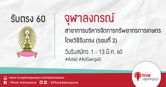 จุฬาลงกรณ์มหาวิทยาลัย รับสมัครบุคคลเข้าศึกษา สำนักวิชาทรัพยากรการเกษตร สาขาวิชาการบริหารจัดการทรัพยากรการเกษตร โดยวิธีรับตรง (รอบที่ 2) ประจำปีการศึกษา 2560