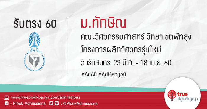 มหาวิทยาลัยทักษิณ วิทยาเขตพัทลุง รับสมัครสอบคัดเลือกบุคคลเข้าศึกษา คณะวิศวกรรมศาสตร์ โครงการผลิตวิศวกรรุ่นใหม่ ประจำปีการศึกษา 2560