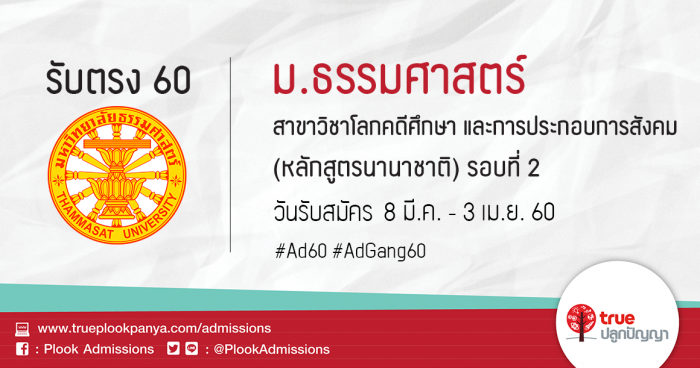 มหาวิทยาลัยธรรมศาสตร์ รับสมัครสอบคัดเลือกบุคคลเข้าศึกษา วิทยาลัยโลกคดีศึกษา สาขาวิชาโลกคดีศึกษา และการประกอบการสังคม (หลักสูตรนานาชาติ) รอบที่ 2 ประจำปีการศึกษา 2560
