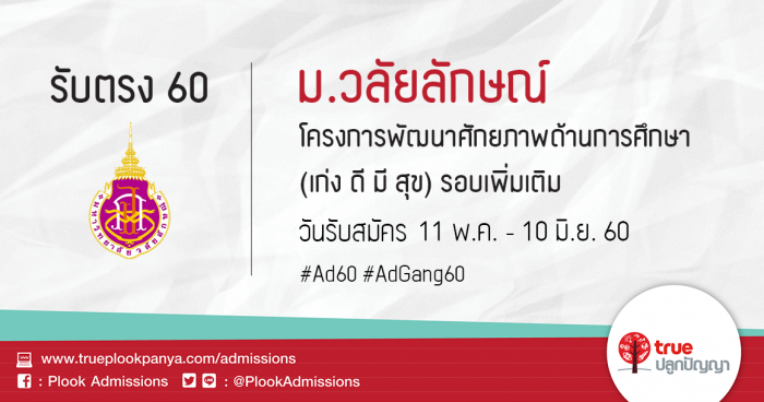 มหาวิทยาลัยวลัยลักษณ์ รับสมัครบุคคลเพื่อคัดเลือกเข้าเป็นนิสิตระดับปริญญาตรี โครงการร่วมพัฒนาศักยภาพด้านการศึกษาสู่ความเป็นเลิศ (เก่ง ดี มี สุข) รอบเพิ่มเติม ประจำปีการศึกษา 2560