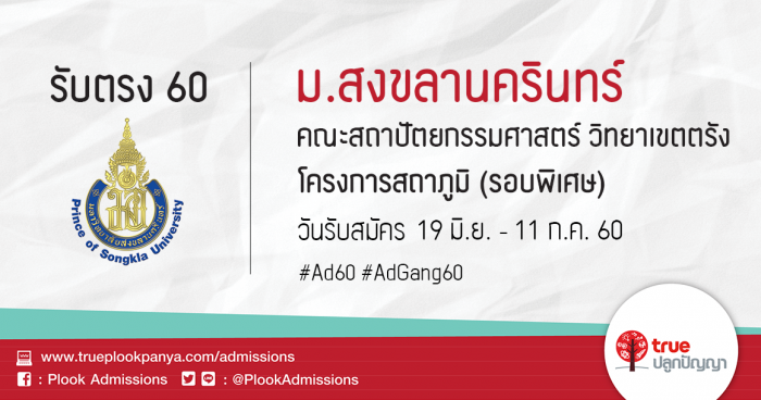 มหาวิทยาลัยสงขลานครินทร์ วิทยาเขตตรัง รับสมัครบุคคลเข้าศึกษาระดับปริญญาตรี คณะสถาปัตยกรรมศาสตร์ โดยวิธีพิเศษ ภายใต้โครงการ "สถาภูมิ (STABHUMI)" (รอบพิเศษ) ประจำปีการศึกษา 2560