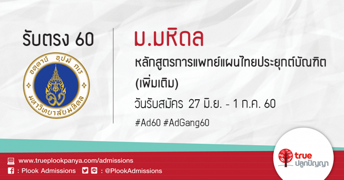 มหาวิทยาลัยมหิดล รับสมัครบุคคลเพื่อคัดเลือกเข้าเป็นนิสิตระดับปริญญาตรี คณะแพทยศาสตร์ศิริราชพยาบาล หลักสูตรการแพทย์แผนไทยประยุกต์บัณฑิต (เพิ่มเติม) ประจำปีการศึกษา 2560