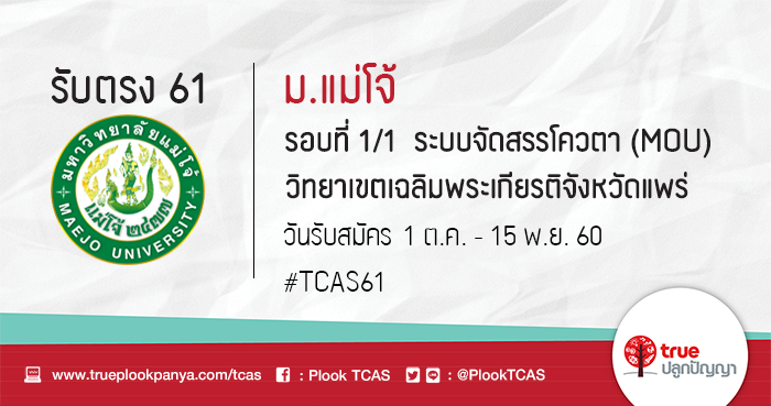 รับตรง 61 มหาวิทยาลัยแม่โจ้ (มมจ.) วิทยาเขตเฉลิมพระเกียรติจังหวัดแพร่ รับสมัครสอบคัดเลือกบุคคลเข้าศึกษา รอบที่ 1/1 Portfolio โครงการระบบจัดสรรโควตา โรงเรียนที่จัดทําบันทึกข้อตกลงความร่วมมือ (MOU) ประจำปีการศึกษา 2560